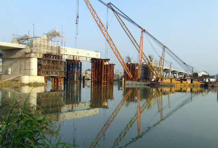 兩艘110T浮吊船抬吊公路橋主跨130T系桿就位