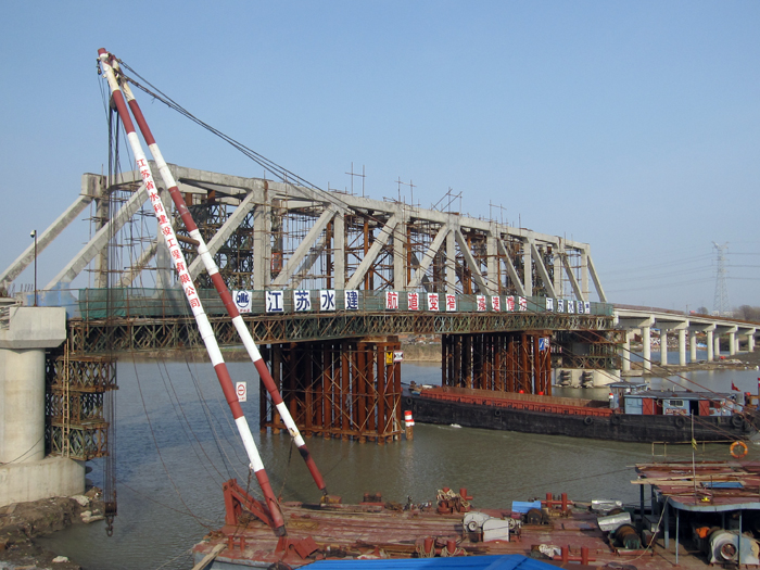 董潭生產橋是南水北調泰州市鹵汀河拓浚跨河橋梁工程兩座中的其中之一,全長348.3米,接線長707.021米,主跨為85米桁架梁,兩側引橋為13孔20米的先張預應力空心板梁。